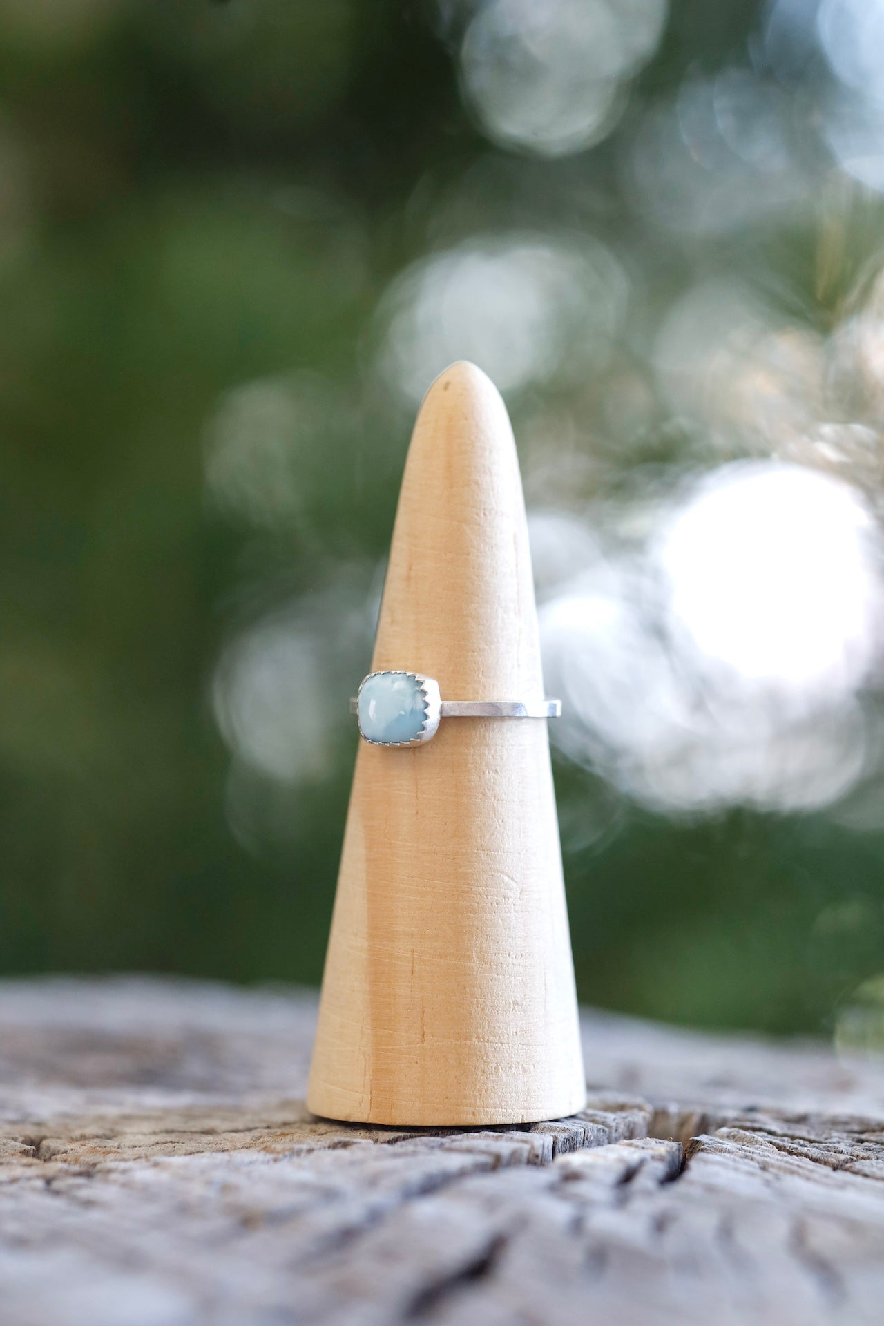 Larimar, exclusively found in the Dominican Republic, has become a fan favorite! This tiny rectangle larimar is the perfect stone for any occasion. Set in a sterling silver setting and a brushed finish. Size 9